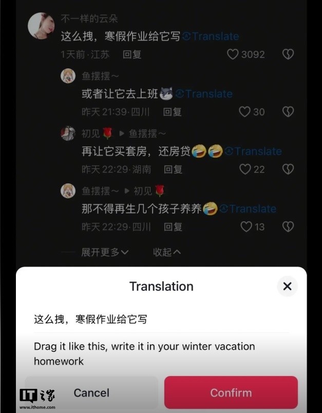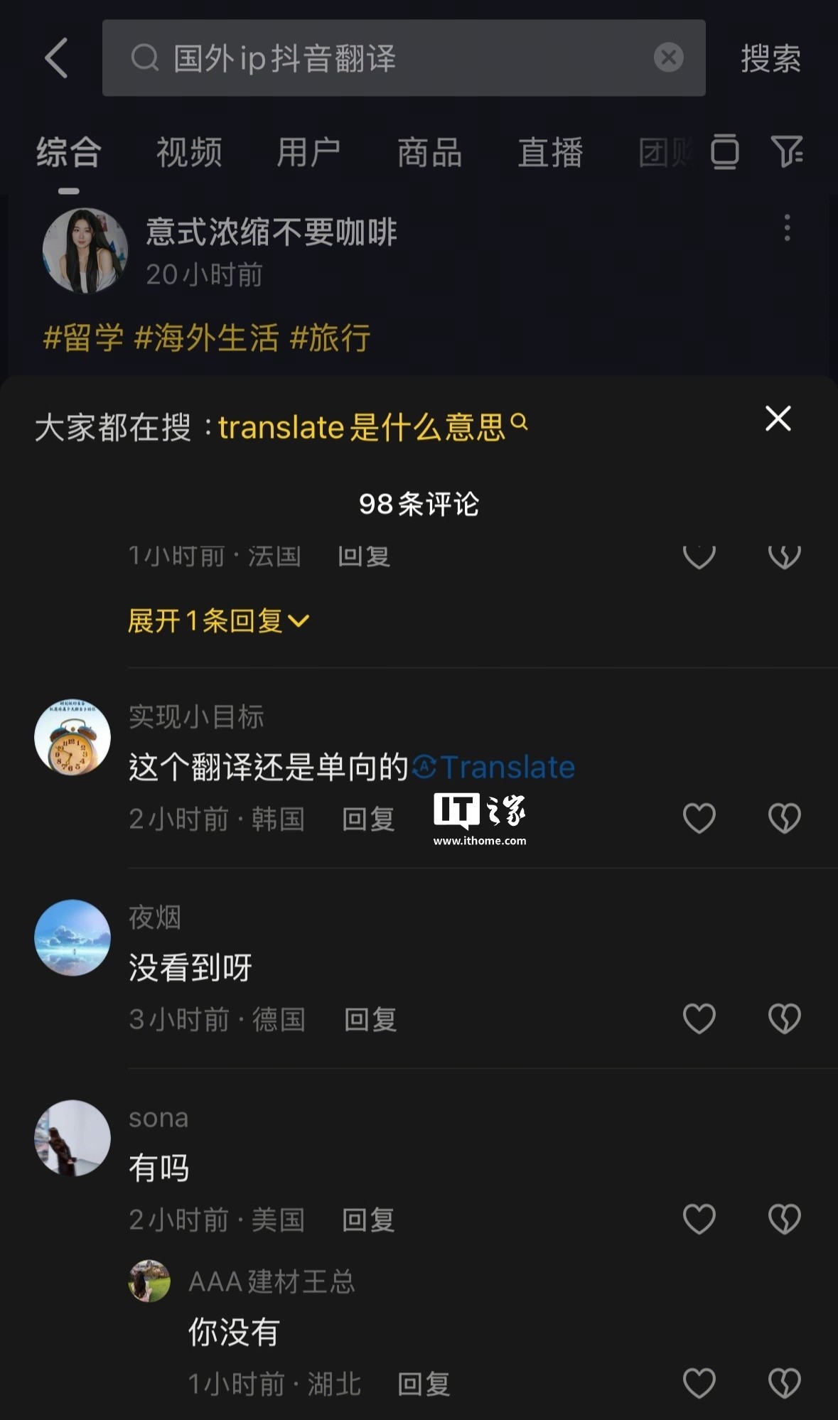 IT之家 1 月 21 日消息,昨日开始,有大量海外 IP 的抖音用户反馈称,抖音评论区出现了“translate”翻译按钮。